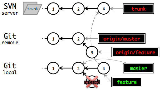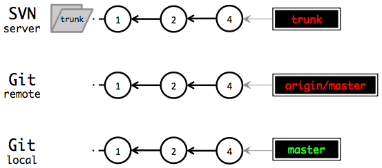 The constant we must maintain between the SVN and Git repository is: The Git repository’s master branch should always be equivalent to the SVN trunk, commit for commit.