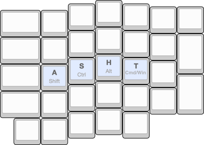 When tapped, letter; when held, modifier key0 “Shift”, “Ctrl”, “Alt”, and “Cmd/Win” along the home row