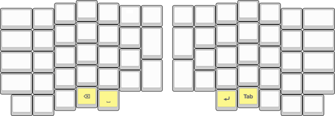 These keys are some of the most used keys on the keyboard, and therefore need to be reached without straining. They’ve all been thrown into the bottom row of keys that were annexed for the thumb. This means no more straining when trying to press Tab, Enter, or Backspace! And Space stays assigned to my left thumb, just like I’m used to.