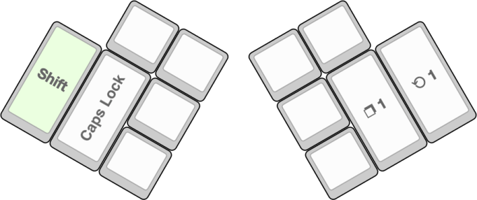 Since Space and Backspace are already accounted for, those nice big thumb buttons are used for layer switching. The big thumb keys, from left to right, are assigned to Shift, Caps lock, Layer 1 switch (tap to use layer), and Layer 1 temporary (hold to use layer). The concepts of the right and left sides are supposed to match: Shift can be thought of as “hold to use Caps” and Caps lock can be thought of as “tap to use Caps”.